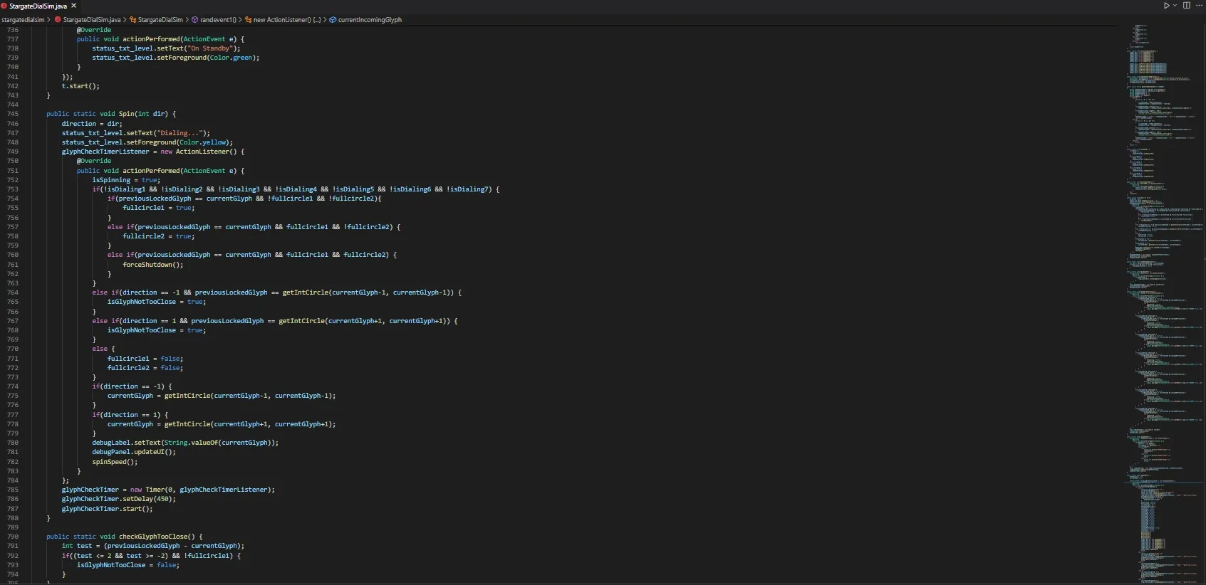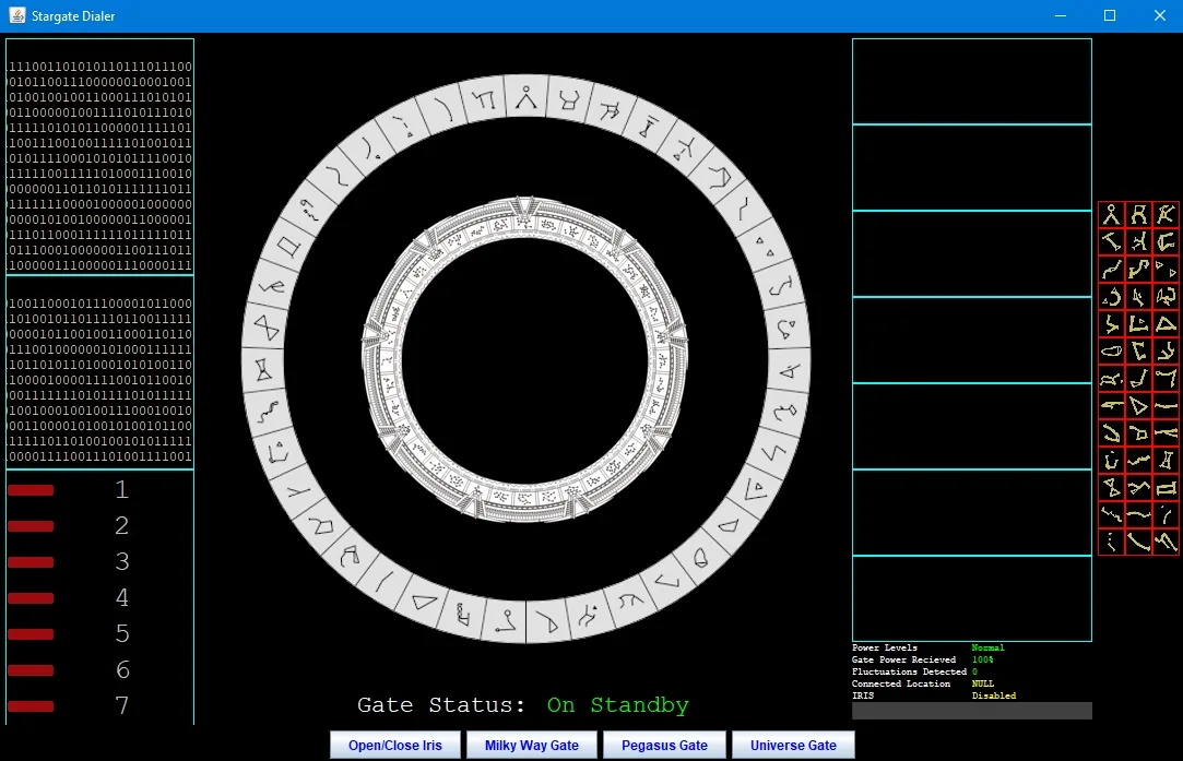 This project was made entirely in JAVA, including JAVAFX. All pictures on this website are works-in-progress. The GUI is going to look much nicer in the future. For now, everything is about functionality. This is more of a side project for now, but in the future I plan on building a 1:2 scale replica of the Stargate. This dialer computer will provide the functionality to allow this gate to work like an actual door. The door can be opened freely on one end, but the other end is controlled via the computer running this program. Although it'll be extremely cool to see, sometimes you need to get through the door quickly. The other mode "Atlantis" will allow for a much faster dialing sequence. The codes can be entered by selecting the symbols, or by typing the numbers each symbol represents, separated by a comma.